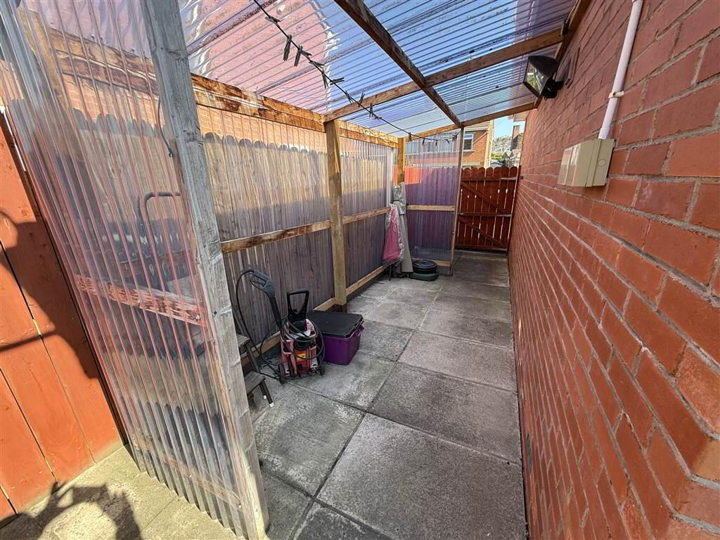 Enclosed rear patio garden in flag stones and decked area, boundary hedging and fencing. Covered area to side. Garden shed with power . Outside light and tap.