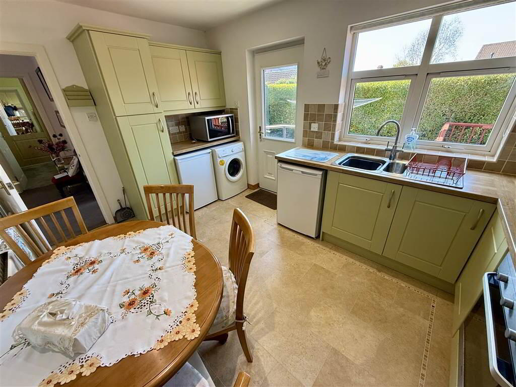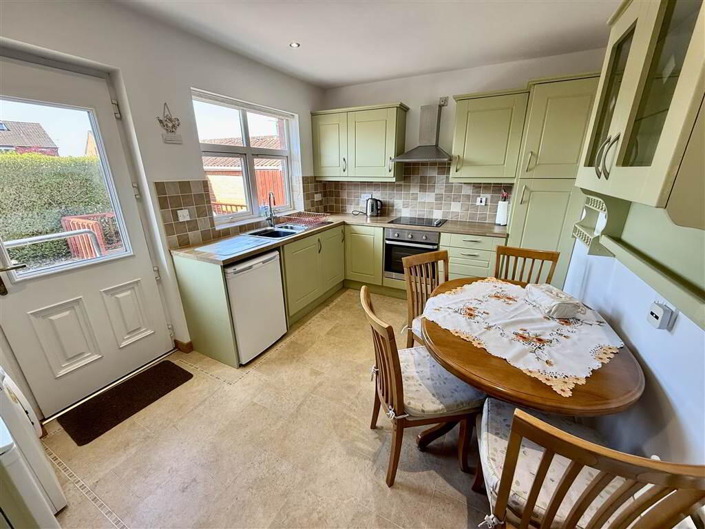 4.11m x 2.84m (13' 6" x 9' 4") Modern fitted kitchen with range of high and low level units, work surfaces, single drainer stainless steel sink unit with mixer tap, integrated stainless steel oven and four ring hob, extractor canopy, glazed display cabinets, plumbed for washing machine, concealed lighting, ceramic tiled floor, part tiled walls, recessed spotlights, uPVC door to rear.