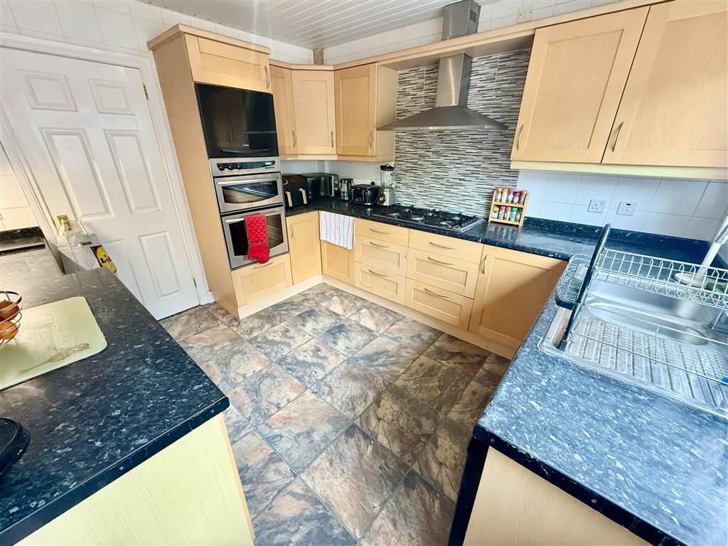 Range of high and low level units with marble effect worktops . Built in 6 ring gas hob, double oven and extractor hood. Built in fridge .. Plumbed for dishwasher. 1 1/2 stainless steel sink with drainer. Tiled floor. Spot lighting. Under unit lighting.