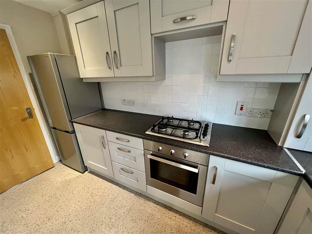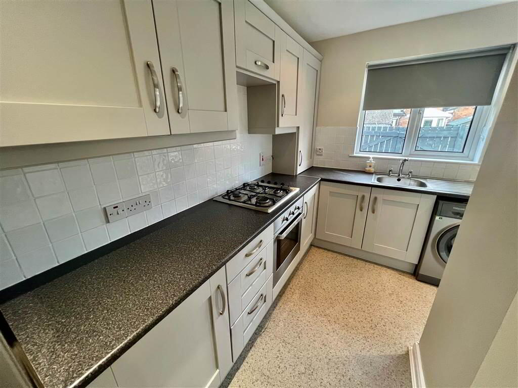 Range of high and low level units with marble effect worktops. Stainless steel sink with drainer. Built in oven, hob and extractor fan. Plumbed for washing machine. Built in extractor fan. Laminate wood floor. Spot lighting. French patio doors to rear.