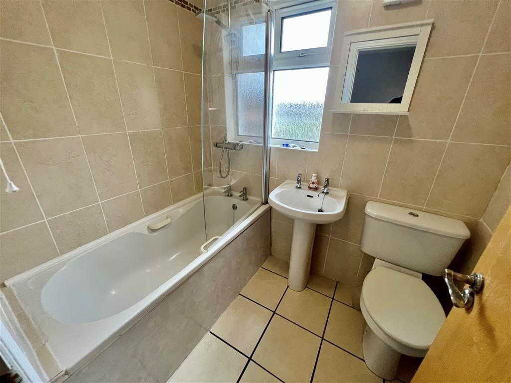 - White suite: Panel bath with overhead shower, dual flfush w.c, pedestal wash hand basin.Tiled floor and walls.
