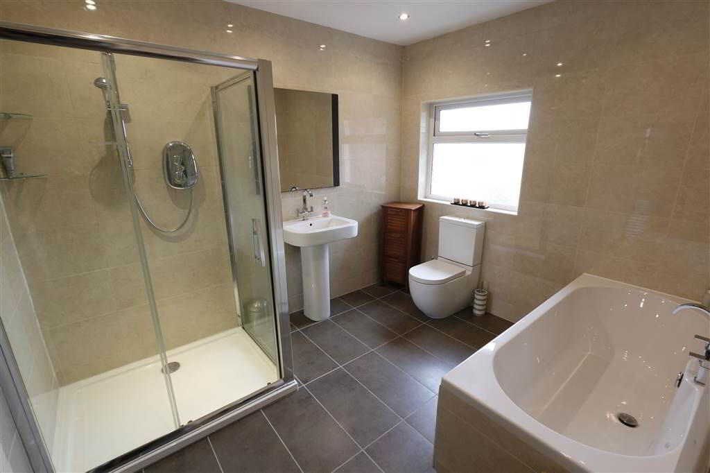 White suit comprising panel bath, walkin shower, dual flush w.c, pedestal wash Tiled walls. Tiled floor. - ROOFSPACE:
